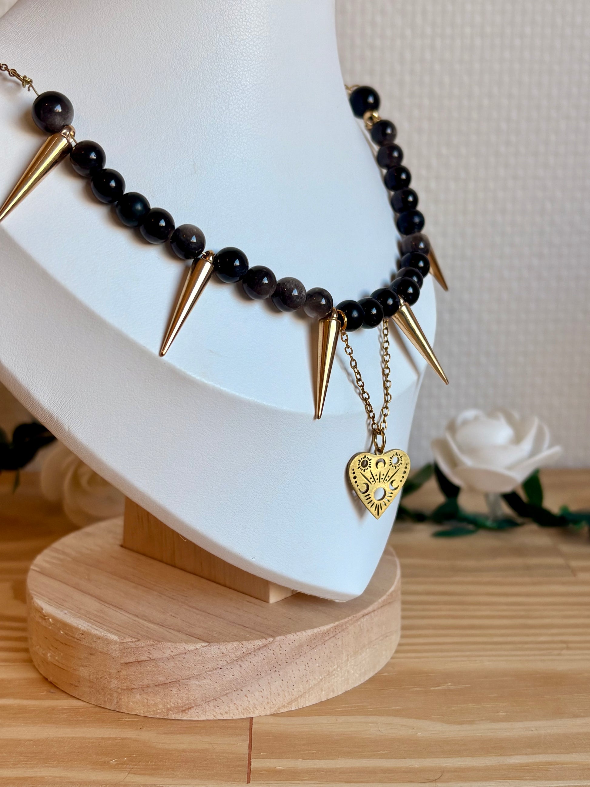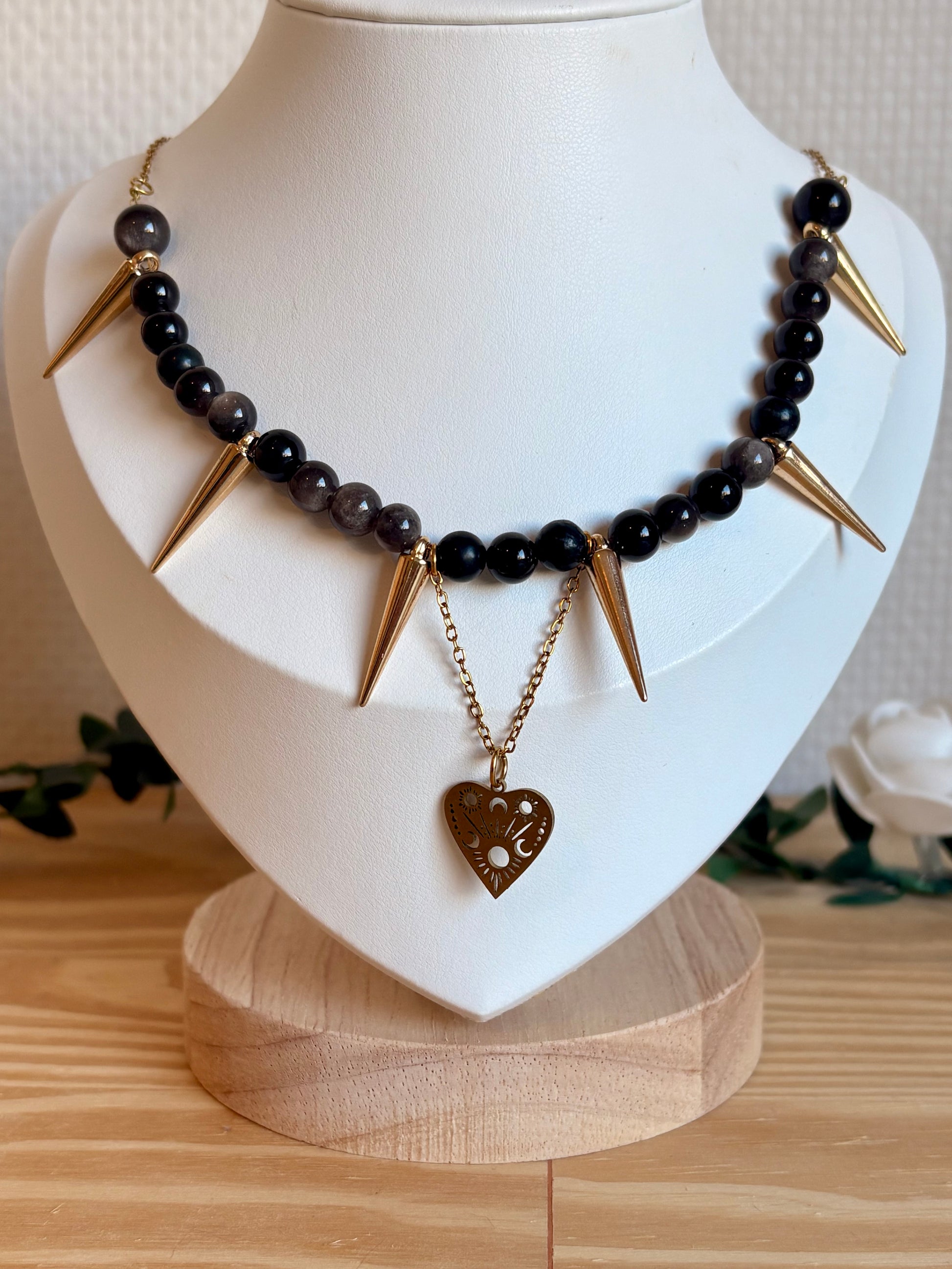 Le collier Antares se distingue par ses perles d’obsidiennes sombres contrastées de pointes dorées, créant un équilibre entre élégance et caractère telle la beauté d'une éclipse.